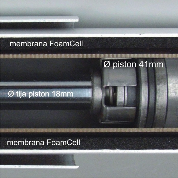 Amortizor twin tube, piston masiv 41mm, 100% lichid de amortizor (membrana FoamCell inlocuieste gazul sub presiune permitind mai mult volum pentru lichid), diametru exterior 60mm, diametru total 70mm