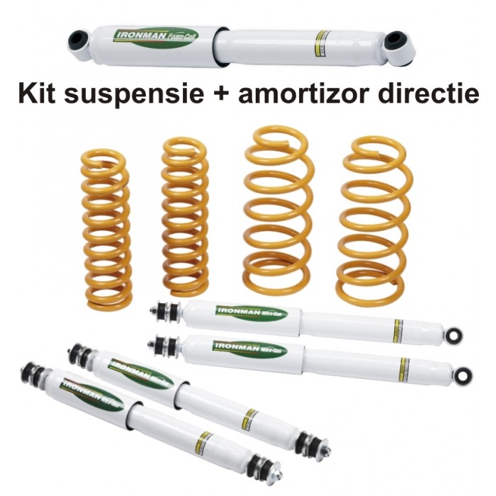 Imaginea prezinta alcatuirea kitului : 4 amortizoare Nitrogas, 4 arcuri elicoidale si amortizor directie.